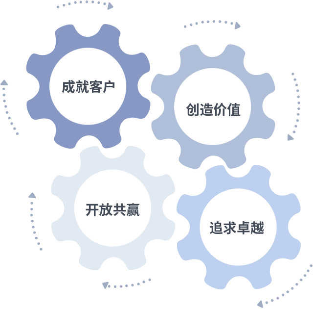成就客户是一切决策的出发点,创造价值是衡量所有工作的标准,追求卓越是蓝狮做事做人的态度,开放共赢是蓝狮的格局也是最终的结果。价值观的齿轮环环相扣,推动着组织里的每个人不断向前。